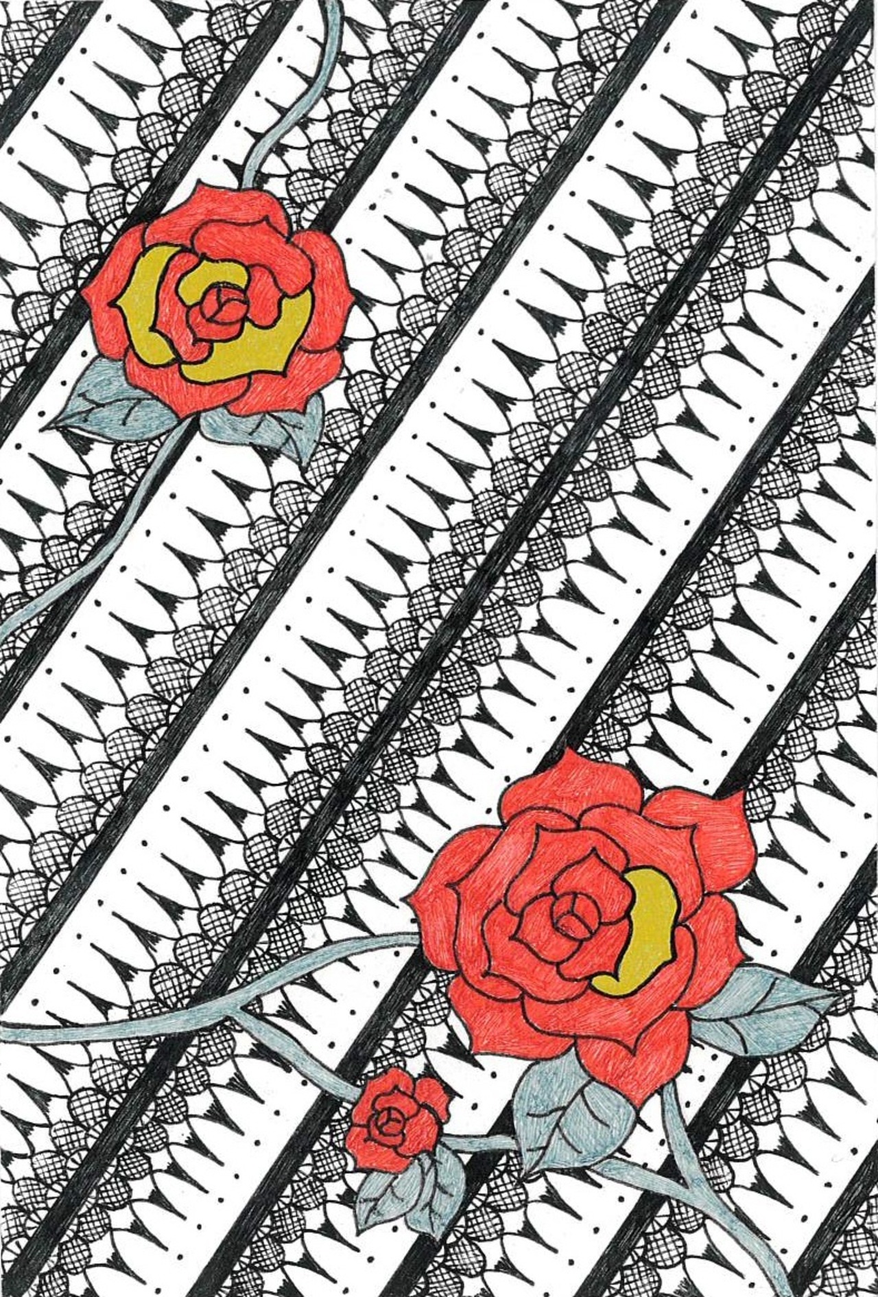 華やかなバラと繊細な執着心柄が印象的なアートポストカードです。赤いバラの情熱と黒の上品さが合わさり、エレガントで存在感のあるデザインに仕上がっています。インテリアとして飾っても美しい一枚。大切な人への想いや特別な日を彩るアート作品のポストカードです。